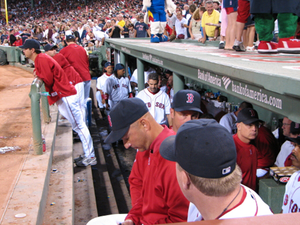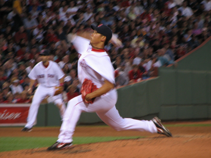Went to the Red Sox game last night. Sat in the owner’s box right next to the dugout, apparently a very dangerous place to be. My niece sat next to 2004 World Series demi-god Curt Schilling for a good part of the evening (I reminded her that he is a Bush supporter lest it go to her head). Daisuke Matsuzaka pitched 8 innings, giving up no runs and only 4 hits and striking out 9 to earn part of his $103 million salary.