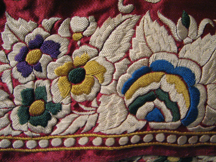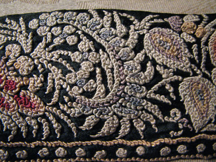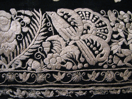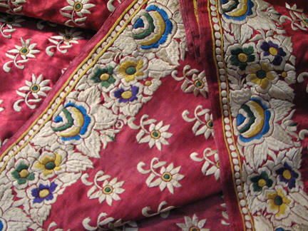 Because these saris took so long to embroider, they were extremely expensive and craftsmen in Surat began to copy them. The border below is an example (this type of French knot work was not done in China). The stitches are tiny (for scale, the border is less than 2″ wide).