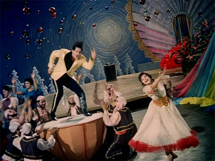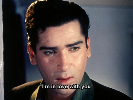 In the same movie, he sings a love song (“Tumne Mujhe Dekha”), secure in the knowledge that his girl has forgiven him when in fact she hasn’t (she’s been duped by bad girl Helen); it breaks my heart, he is so transparently happy, but I know everything is about to come crashing down around him.
