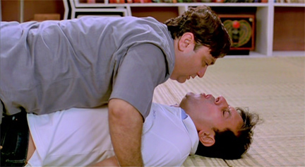 On Friday, Ranjeet is relaxing by a pool when he’s hit by a child’s ball and twists his back (also knocking his cell phone into the water). He makes his painful way home, where Sheetal calls Dr. Shepard (Tom Alter) to come and have a look at Ranjeet’s back. They fight once again about his Friday night dinners and she leaves in a huff. The doctor arrives and advises Ranjeet not to go out that night. When Bharat shows up, Ranjeet reluctantly tells Bharat that they need to reschedule for the next week. Bharat cheerfully agrees and Ranjeet invites him to sit and stay for a while. It is quickly apparent that Bharat might be the most oblivious and annoying person on the planet, and is a sure winner at the idiot’s dinner. Ranjeet decides that he can’t afford not to take Bharat to that night’s dinner. As Bharat helps him towards the door, he trips and they fall, which doesn’t do Ranjeet’s back any good at all: