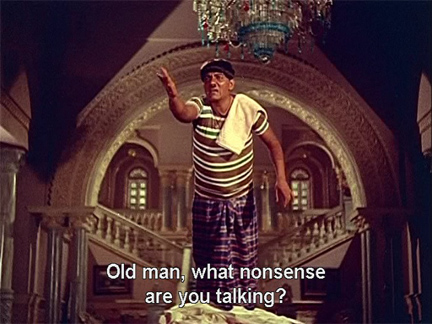 Hungry and confused, they follow the sound of a mysterious song (“Gumnaam Hai Koi”) until they reach a large haveli. There, they are greeted by a strange, somewhat belligerent, dhoti-clad servant (Mehmood) who appears to have been expecting them.