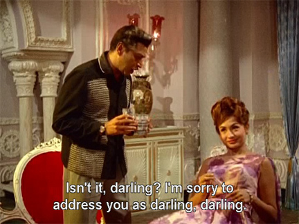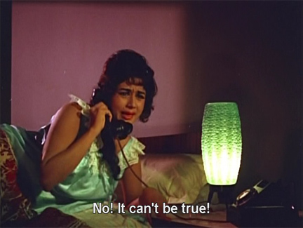 This film’s positives are the great songs by Shankar-Jaikishan, the choreography, the filmi noir set decoration, and the Helen-Pran chemistry. Gumnaam is familiar to western audiences because the film Ghost World used its first song (“Jaan Pehchaan Ho”) in a scene. This song kicks off the journey into a crazy world where bouffant hair meets men in dresses; giant Easter Island statues with glowing red eyes compete with Helen for your attention; and a killer on the loose stalks his terrified victims. The drawbacks include a patchy and nonsensical plot, and Nanda and Manoj Kumar as the lead pair (Shammi and Asha Parekh would have been so much better!), but this is nitpicking when compared to the pluses.