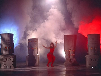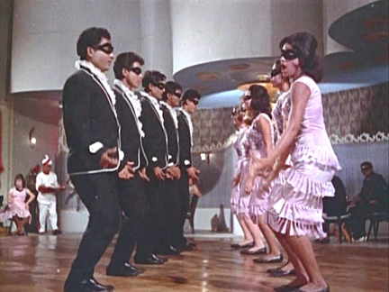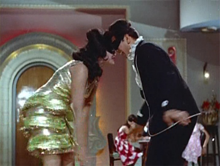 Then he, too, is killed, shot by a mysterious gunman in a trench coat. Cue credits, then on we go to another nightclub, where we are treated to the awesomeness that is “Jaan Pehchaan Ho”—it features (among many things) masked men in ruffly tuxedos doing a stiff, spastic (think Devo) version of the twist with a woman in a gold lame dress (Laxmi Chhaya), accompanied (note the band’s name) by a singer* who appears to be convulsing: