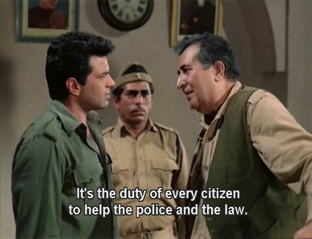 Anyway, our film opens with a thief named Ajit (Dharmendra) being nabbed by a one-armed man (the first of many similarities with Sholay—see if you can count them all!). He is put in jail for six months after telling the judge that since he has been an orphan since childhood he’s been given no opportunities to work and build a life like ordinary people. He also confronts Major Jaswant Singh (Jayant), the man who caught him, asking why he interfered: