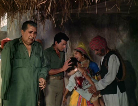 Anju’s father has recognized one of Jabbar Singh’s men, who used to live in the village. He agrees to testify in court against the man. Cue the Sergio Leone music. Jabbar Singh soon comes back, and kills Anju’s father as she runs from house to house looking for help. Doors stay firmly closed and locked. Ajit and the Major hear the gunshots from the fields where they are working, but get there too late.