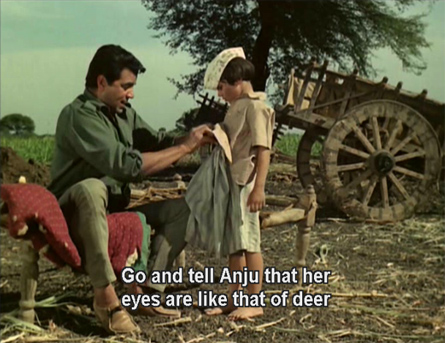 On arrival, Ajit is greeted by a woman as her long-lost son—killed by the dacoits years ago, driving her mad with grief. Then as he is out walking, he comes across a group of pretty village girls bathing. They spot him spying on them and, led by Anju (Asha Parekh), throw cow-dung at him. Anju is the daughter of the village chief, and Ajit is quickly smitten with her. He meets and befriends more villagers, including Motumal and Chotumal (Asit Sen and Bhagwan) who are cheerful (and amusing) drunkards. He enlists a little boy Munna—who is Anju’s brother—to help him romance Anju by carrying messages to her, and gives him a pair of the Major’s shorts (since he is half-naked).