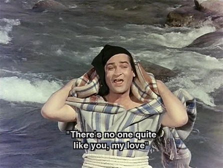 It’s time for more Shammi, in brilliant Eastman Color! Janwar is one of my favorite Shammi films (okay, I know I always say that), because it’s chock full of crazy outfits and disguises, great repartee between Shammi and his sidekick Rajendranath, and the presence of Prithviraj Kapoor and Rehman as well. It also has a great fast-paced story full of fun, and the songs by Shankar and Jaikishan are brilliant.