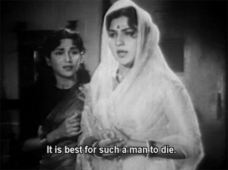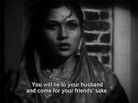 I cheer. No weeping, self-sacrificing bahu-beti here! Besides, Kamla cries enough for both of them. Karuna says she will confess, but Kamla begs her not to or else her reputation will be ruined. Kamla’s husband drags her off home soon enough, though, and we are spared.