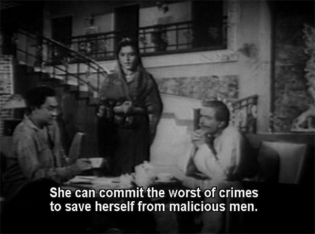 I cheer. No weeping, self-sacrificing bahu-beti here! Besides, Kamla cries enough for both of them. Karuna says she will confess, but Kamla begs her not to or else her reputation will be ruined. Kamla’s husband drags her off home soon enough, though, and we are spared.