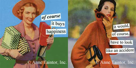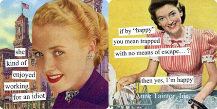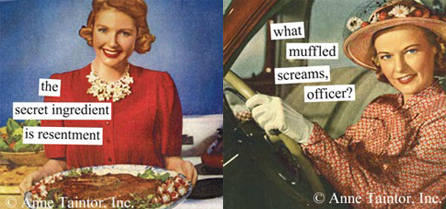 One of my favorite product lines is that of Anne Taintor. She has taken old advertising images from the 1950’s (picture-perfect happy housewives) and put her own captions on them.
