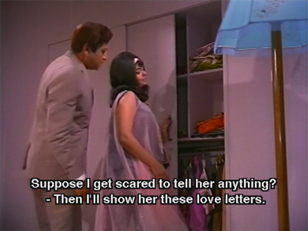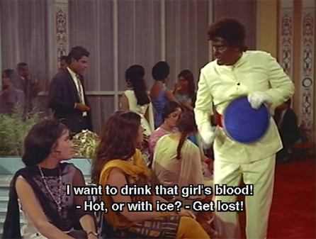 Brahmachari consoles her, telling her he will meet Ravi and help her out. He heads over to Ravi’s house and finds a birthday party in full swing. Posing in such politically incorrect blackface as a waiter, Brahmachari eavesdrops on the party guests and discovers that Ravi is a womanizer and cheat of the worst kind, and the current object of his affections is Rupa (Mumtaz).