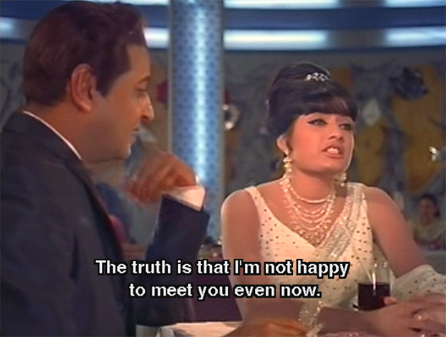 Anyway, that evening Brahmachari takes her to the club where he works as a singer. Ravi often comes there, and tonight is no exception. He asks Brahmachari to introduce him. Sheetal’s response to Ravi’s advances is cool.