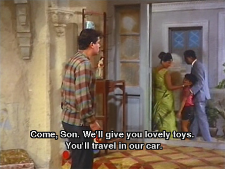 The next morning when the couple arrive to adopt one of the children, the kids have smeared mud all over themselves and behave like little hooligans. It doesn’t make any difference, though, and they pick Ujala (Sachin). It’s a heartbreaking scene as Brahmachari makes him go with them for his own good.