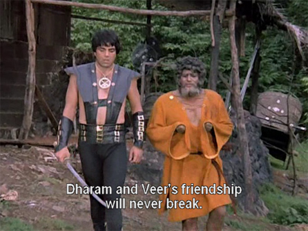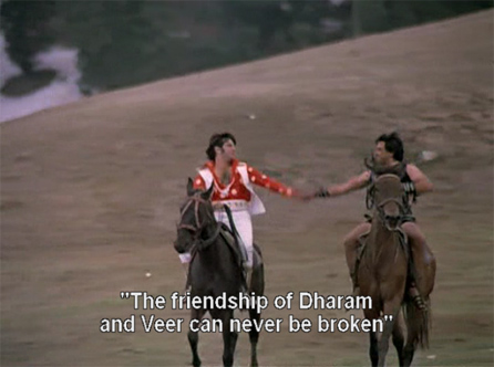 The next day Veer goes to meet Dharam and they exchange birthday gifts: the arrow from Dharam and a horse from Veer. It’s quickly established that their love for one another is enduring.
