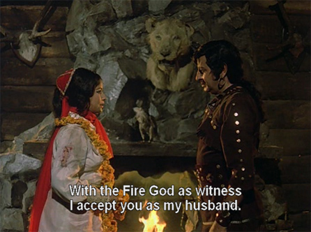 Their post-connubial bliss is interrupted by a tigress, and Jwala goes after it. Meenakshi follows and finds a bloodied and mauled body wearing Jwala’s cloak. She faints, is found by palace guards, and taken home in a catatonic (no pun intended) state.