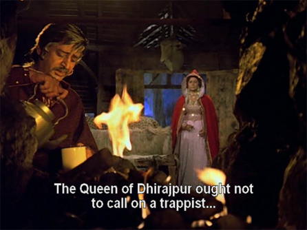 Wonder Woman? A WWI-era Kaiserin? I am delighted (and distracted) by this craziness. Dharam wins the jousting contest and asks for the Rajkumari’s hand as his prize. Like father, like son!