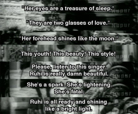 Essentially this is the story: A poet (KL Saigal) sees a girl named Ruhi (Nasreen) who is so beautiful that he writes volumes of poetry and songs about her, thus spreading her fame to millions of men. When her father tries to get her married, crowds of would-be suitors show up and create havoc so that the wedding can’t continue; and several of her brothers have been killed trying to protect her.