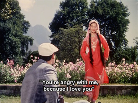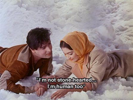 I also love that Shammi is just about the only person who doesn’t fall for the “she had another man’s baby” story, and the only person who can go into the cabin in Kashmir without taking advantage of the woman he’s with. (That cabin turns up in a lot of movies!)