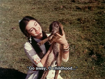 She’s learned a thing or two from Gandhi! She even makes him buy flowers for poor Mala when she takes him to visit. She and her father keep Mala’s condition a secret from him; the doctor merely says that she needs rest. The next day Raj begins her campaign, with the lovely song “Kashmir Ki Kali Hoon Main.”