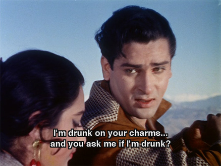 Before we saw this movie, I kept trying to explain the power of Shammi’s bedroom eyes, but my dh just didn’t see it. After the cabin scene, when Shammi is reciting poetry, he turned to me and said, “Is that what you mean about his eyes?”