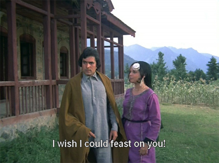Chastened, the men slink away and Mangal continues his journey. The scenery is spectacular, I might add; the movie was shot mostly in Kashmir and it’s beautiful. He ends up in a small town where he meets a feisty young woman named Bijlee (Mumtaz) when he tries to steal some bread from her small restaurant.