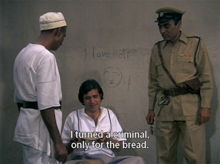 He wants to quit the crime business and open an “eatery” where everybody—rich or poor—can eat together. Suraj has other ideas though; his plan is for Mangal to inherit his business and keep it running. Mangal refuses his offer of dinner, saying that his stomach prefers the simplicity of bread.