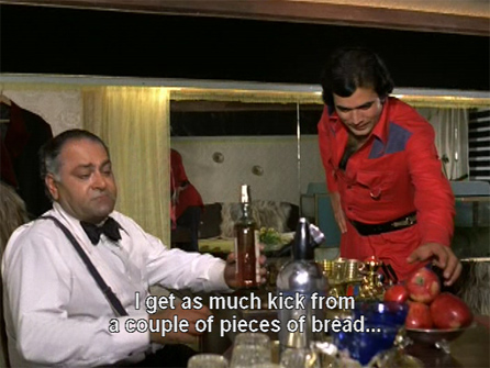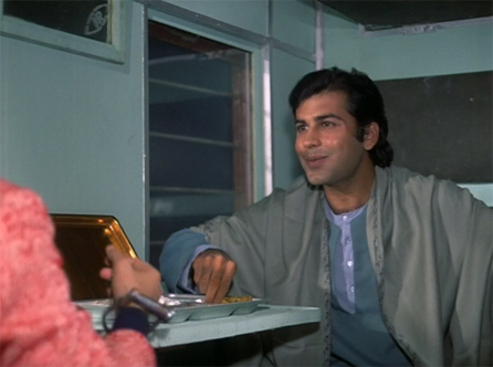 He gets on a train and follows the smell of roti to a compartment. Its occupant is a nice young man (Vijay Arora) who offers to share his food with Mangal. They are having a nice chat and eating, when the young man notices Mangal’s handcuffs, still hanging on his wrists.