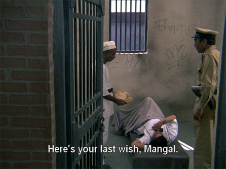 A bread duel! In fact, it is actually quite disturbing—it’s so primitive and raw, these fisticuffs over a hand-sized roti. Man reduced to his base self, fighting out of pride and not hunger. It ends when Mangal accidentally stabs his opponent, killing him, and the police arrive and arrest him.
