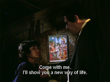He also meets a blind couple (Om Prakash and Nirupa Roy), who mistake him for a friend of their son’s and take him in.