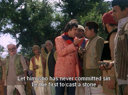 In one town there is a big commotion going on. A young woman is being stoned by the local men for being a dancer, and having loose morals. He goes to her rescue with a song whose lyrics come straight out of the Bible (“Yaar Hamari Baat Suno”).
