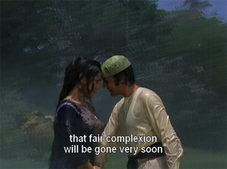 Bijlee has been chasing after Mangal for some days, and wins him over with yet another lovely song, “Gore Rang Pe.” Rajesh Khanna and Mumtaz have such great chemistry, it’s no wonder they were such a hit pair.