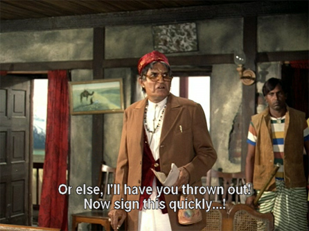 This moneylender has turned nasty and bitter after his only daughter was lost at a fair years ago. He is also hoarding grain, which Mangal discovers on his way home one day. He sees the moneylender’s men hiding sacks of it underneath a haystack, and leads the townspeople to it while singing another great song “Yeh Public Hai” which extols the power of the masses: