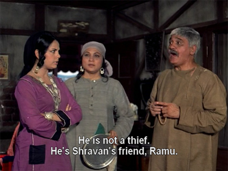 He also meets a blind couple (Om Prakash and Nirupa Roy), who mistake him for a friend of their son’s and take him in.