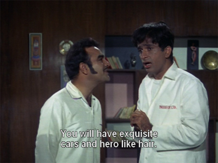 I also fail to understand Nanda’s bright blue contact lenses, even though a lame attempt to explain them is made later on. But I digress. Raju finds a new job as a masseur, and is called to a real Prince’s palatial home.