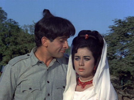 Having discovered love himself, Pratap Singh is sympathetic when he finds out that Raju is in love with Poonam, and heartbroken at her continuing wrath (even in the face of a song he sings to her out on the lake, “Kal Raat Waali”). He helps Raju by getting rid of Kunwar (an elaborate costume drama which is pretty funny), and love blossoms after a few more mishaps.