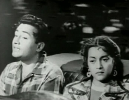 Rupa is most upset at the sight of this unknown dashing young man at the wheel of her car, and she crashes into a tree, hurting her wrist. Even in a bad mood, Nalini Jaywant is really beautiful; she reminds me of a cross between Helena Bonham Carter (before she got married to Tim Burton and began to dress like a freak) and Vivian Leigh. Amar (he tells her his name is Raj) drives her home, singing a lively song along the way (“Jeevan Ke Safar”) and teasing her mercilessly. She is not pleased.