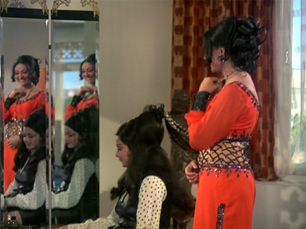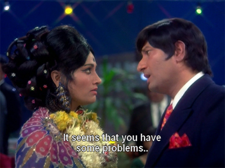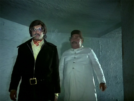 Now on to the more salient matter at hand; DOUBLE CROSS was a diabolical film, and an absolute cert in the “so bad its hilarious” category, in my humble opinion. the only real redeeming feature of this film, was some of the dialogue ( kuljeet and his annoying/endearing “rekhaaaaaaaa!”, “saari zindagi andhey ban key phirogey!” etc), crazy over-useage of “sfx” camerawork, and a scene where dev kumar for some reason walks down a stairway with his shirt unbuttoned ( he didnt even bother to suck his stomach in) and most of the songs. The backing score by was by R D BURMAN, which makes sense, but doesnt explain why early on when vijay anand’s pehla pyar gets married for money, there is a very annoying “high speed” shehnai parping away on some kind of repeated loop, whilst he looks angst ridden. I should still have the SUPER 7 33/1/3rd rpm ( “electronically reprocessed for stereo” – my years as a musician and producer are put to shame with this proclaimation, but its a useful effect..or was at the time, i guess), with heavily truncated versions of some of the songs, which tickles me no end. But more importantly, i should still have it on DVD, too. This was one of the funniest and poorest of vijay anand’s efforts, especially compared to tere mere sapne which he was also in, during 1972, and KORA KAGAZ, where he didnt bother with a wig, if i remember correctly. So the 64000 dollar question will forever remain; WHY did Vijay Anand chose to wear such a horrendous wig for this film?