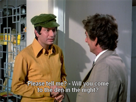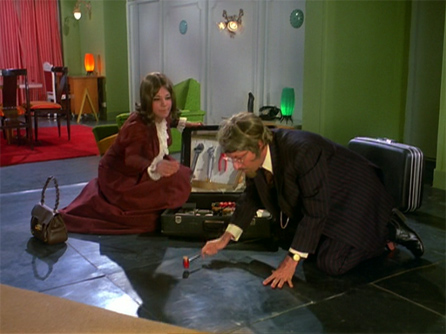Of particular interest here (besides Lily and Jimmy’s “disguises”—they look like refugees from the 1890s) is this violently green hotel room. Just look at all the decorative details!