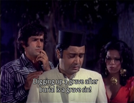 They load Sharmili into the car to go to the hospital. On the way, she pretends to expire, and Bhola agrees not to turn Pravin over to the police for the price of Rs 50000. They “bury” Sharmili (who hides while Pravin is busy digging the grave) near some ruins at Borivali. Spying on them is Shankar, who sees everything.