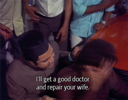 Bhola sets up a huge fuss over his “wife’s” injuries. The unfortunate driver, a man named Pravin Chandrashah (Deven Verma) is distraught and begs Bhola not to call the police as a crowd gathers.