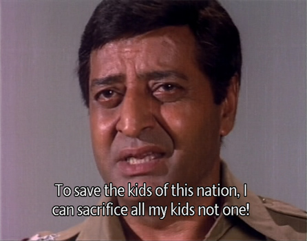 Of course Iftekhar is the Police Superintendent! Elsewhere in town, Shankar is visiting Bhola when John comes in. They recognize each other and Shankar tells John about the child he kidnapped. John is aghast; they immediately tell Shankar who he really is. Shankar asks them not to tell Kumar or Shyam since he’ll be a disappointment to them.