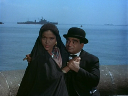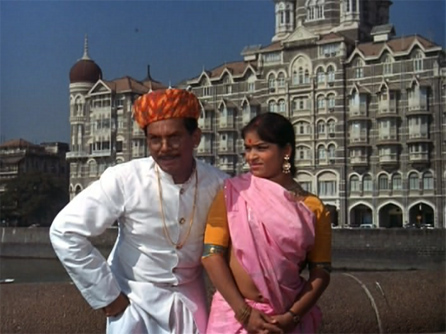 Madhu once again is our trivia queen. She knew that the film is Do Raaste (1969), and the song is “Apni Apni Biwi” picturized on Junior Mehmood (sung by Usha Mangeshkar). It was filmed at the Gateway of India by the Taj hotel. It is quite hilarious, with three couples in guest appearances illustrating the “dark” wife, the “fat” wife (Indira) and the “short” wife, and their husbands who are all “very proud” of them! Johnny Walker was the husband of the “short” wife but I don’t recognize the actress. The other couple (the “dark” wife) both look so familiar (she looks kind of like Zeenat Aman–in blackface–but I think it’s a little before her time; and he is a comedian I think), but I can’t place them. Can anyone help me out? Madhu? Here they are: