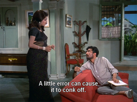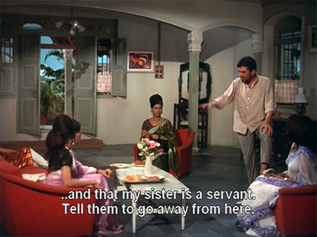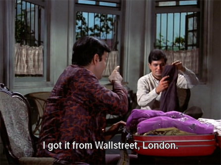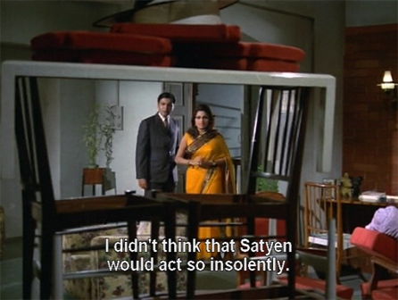 Incidentally, with reference to your third screen cap, our Bombay filmdom knew their clothes better than we give them credit for—here obviously the subtitling is the culprit. Viju actually notes he got the pullover for Satyen from Bond Street in London not Wall Street. Indian subtitlers of the 60s would’ve picked up the correct reference whereas this one didn’t probably because he’s grown up in an India where the American influence dominates. Not so in the 60s and 70s when Britain ā€œVilayatā€ dominated the foreign shores discourse.