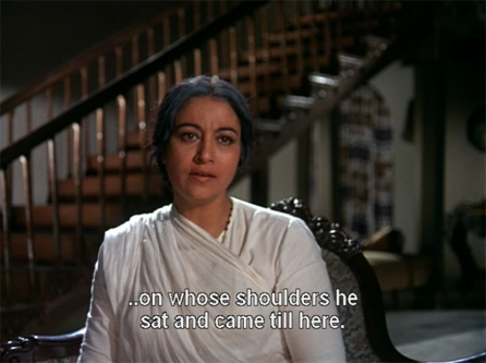 Instead Bindhu just transforms into evil-witch incarnate. I mean, who takes her husband to watch a cabaret(?) dance when his mother is dying. And who removes the sacred-father-in-law portrait. Does this woman have no tact ? [Also aside note, why do all villainous bahus always start with refurnishing their in-laws house ? Case in point Nadira in Dil apna aur preet parai] And loses any chance at subtlety and winning any sympathy from the audience. So all her brilliant repartees to Ma about “you just like your elder bahu because she says yes to whatever you say” are totally wasted.