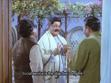In reality, however, he is corrupt and greedy, always scheming to make more money off the backs of poor people. He is assisted in these nefarious endeavours by Sevaram (Kanhaiyalal), a shop owner who dilutes his grains with stones and milk with water; and Satyanarayan (Madan Puri), a contractor who uses too much sand in his cement, causing his buildings to collapse pretty quickly, crushing children and the like.