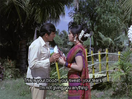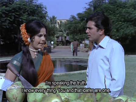 “Loafer” is another of those Hinglish terms that I love, by the way. He gives her his watch as security and promises to pay her the next day, but that night Chanda’s drunkard of a brother (Satyendra Kapoor) takes the watch and sells it to buy liquor. Horrified, Chanda works extra long hours doing yucky odd jobs to earn the money for a new watch. When she gives the money to Aakash, he buys her a sari instead and their romance begins.