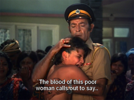 She bursts out at him as Raju did earlier, for the same reason—trauma at seeing her sister raped and killed along with her brother (she still believes he drowned of course). Ralhan does such a nice job showing the psychological effects of trauma, and how people are affected even decades later by it. Anyway, Ashok helps her escape the police dragnet and tells her that he wants to see her again.