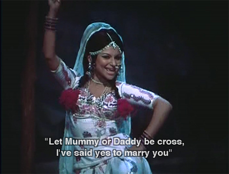 Sonia is an orphan living with her kindly uncle (Madan Puri) and his shrewish wife (Achala Sachdev). When Sunil lands a good job, he asks her uncle for permission to marry her. Her aunt objects strenuously as she’s found a rich (but seriously ugly) husband for Sonia. The lovers declare their defiance with another song and dance, “Ab Chahe Maa Roothe.”