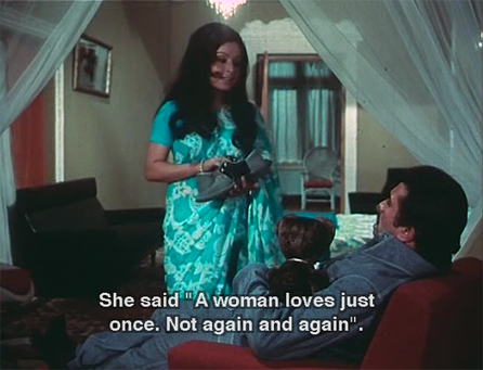 I also find the whole Gulshan Nanda link fascinating given that he is said to have reworked the second half of Aradhana and suggested to Shakti Samant that he retain RK for the role of the son. And then, of course, there’s the Kati Patang connection. Daag has many of the tropes that propelled RK to stardom (young man impregnates lovers and is either dead or assumed dead), and in that sense Yash Chopra banks heavily on those tropes and the RK-Sharmila jodi. It has a darker undertones but overall, to me it does seem as though Yash Chopra reworks a hit formula but never repeated the stars (or music director) associated with it – except Rakhee.