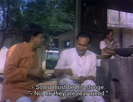 He first visits the factory, and deliberately identifies Somu as a friend of Vicky’s—hoping that a betrayed mob will take care of Somu for him. Somu does get a thrashing at the hands of the other workers, but is saved from death by Bipinlal and then forgiven when they realize that he has come to care about their plight. This creates a rift between Somu and Vicky, though, when Somu refuses to leave the basti. Feeling hurt at his friend’s defection—to the very people who have beaten him up—Vicky storms off.